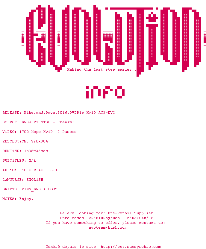 Voir le nfo de la release Mike.And.Dave.Need.Wedding.Dates.2016.DVDRip.XviD.AC3-EVO
