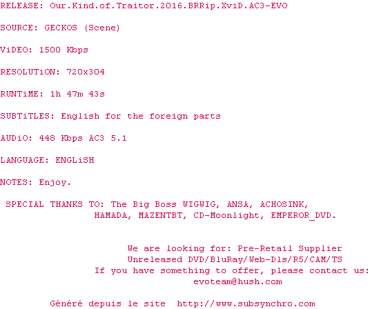 Le commentaire de mynameisfedo Commente par mynameisfedo (19), Le Jeudi 24 Novembre 2016 à 02h14 crédibilité ou pas, la réalisation et l'interprétation sont à la hauteur d'un film rythmé et finalement très prenant. hautement recommandable en ce qui me concerne. 9 / 10 0 0