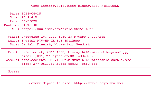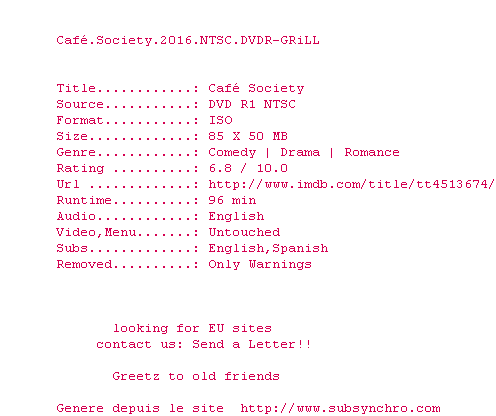 À voir aussi son très bon film dont le récit est tiré d'une histoire véridique sur le charlatanisme des médiums Spirites du début du siècle: Magic in the Moonlight de 2014 et surtout son chef d'oeuvre post ans 2000, à mes yeux, qui est Blue Jasmine avec l'éberluante Cate Blanchett de veau.. désolé!