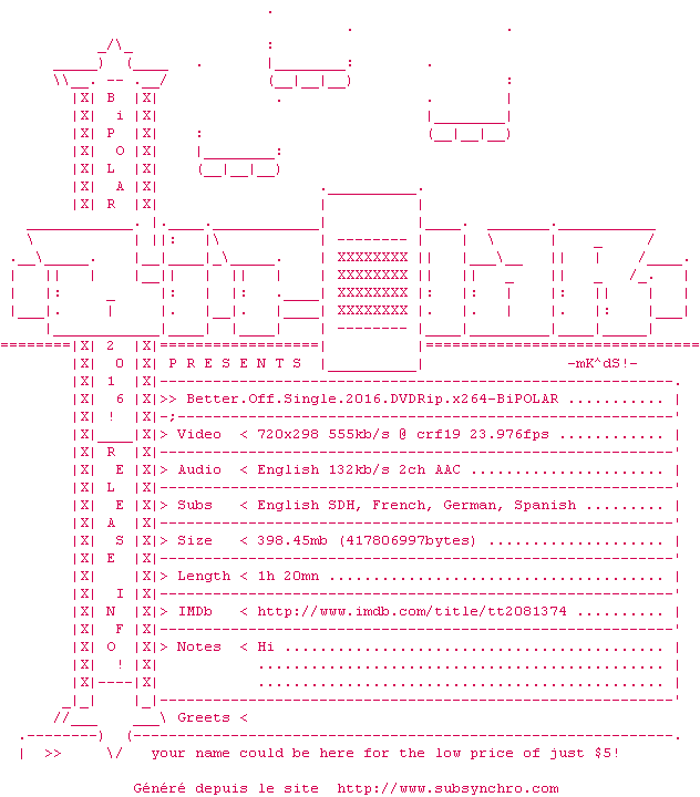 | Voir le nfo de la release Better.Off.Single.2016.DVDRip.x264-BiPOLAR | BiPOLAR | Better.Off.Single.2016.DVDRip.x264-BiPOLAR OpenSubtitles | 0 fichier | ||