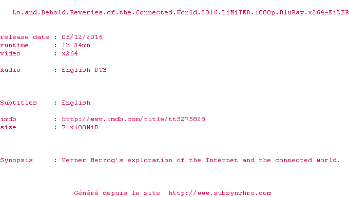 Voir le nfo de la release Lo.And.Behold.Reveries.Of.The.Connected.World.2016.LiMiTED.1080p.BluRay.x264-EiDER