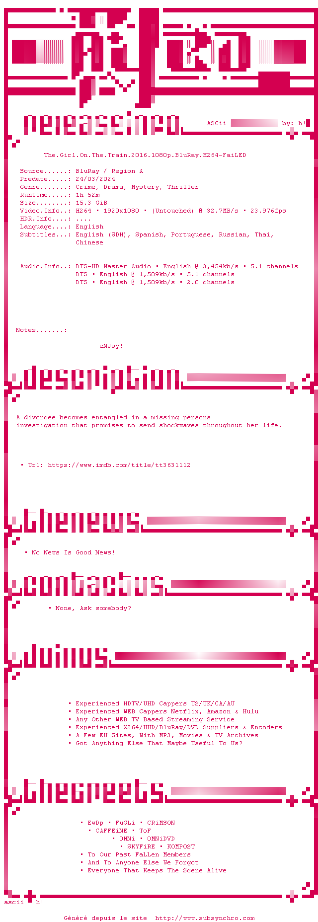 Voir le nfo de la release The.Girl.On.The.Train.2016.1080p.BluRay.H264-FaiLED