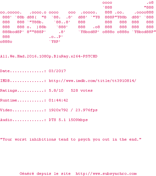 Voir le nfo de la release All.We.Had.2016.1080p.BluRay.x264-PSYCHD