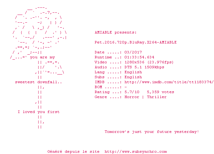 | Voir le nfo de la release Pet.2016.1080p.BluRay.x264-AMIABLE | AMIABLE | Pet.2016.1080p.BluRay.x264-AMIABLE OpenSubtitles | 0 fichier | ||
