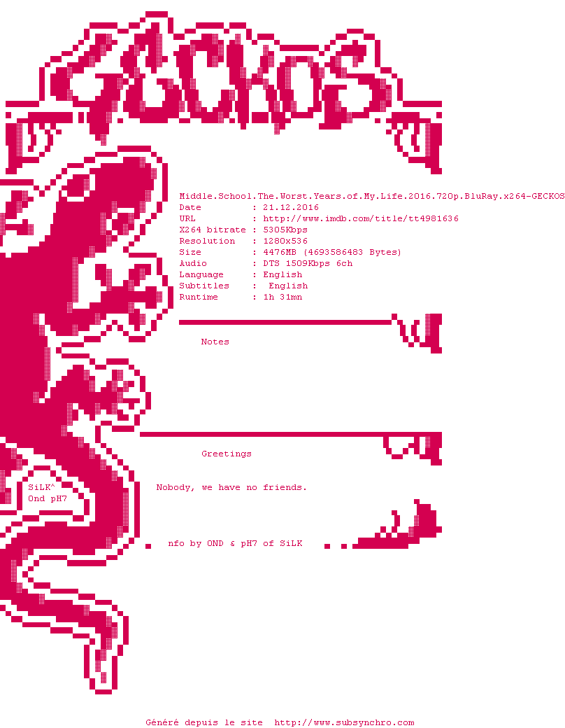 Voir le nfo de la release Middle.School.The.Worst.Years.Of.My.Life.2016.BDRip.x264-GECKOS