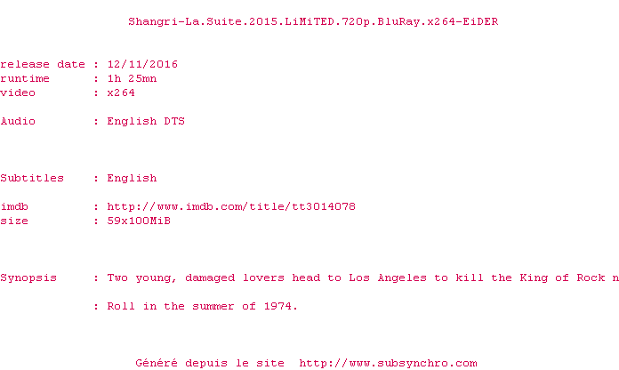 Voir le nfo de la release Shangri-La.Suite.2015.LiMiTED.720p.BluRay.x264-EiDER