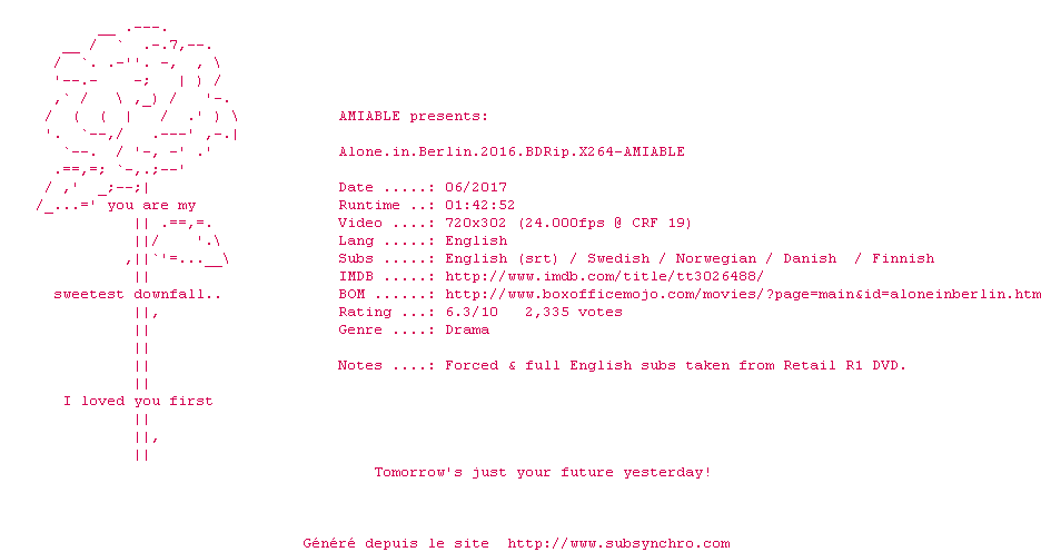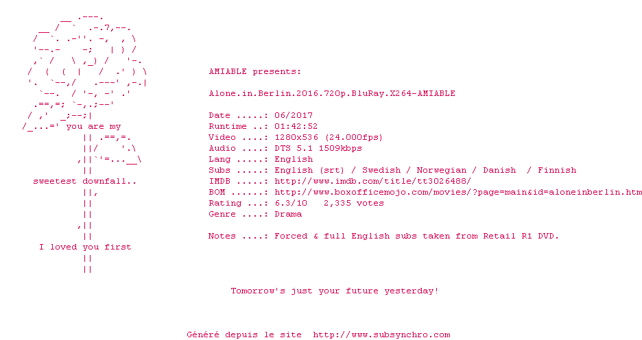 Voir le nfo de la release Alone.In.Berlin.2016.720p.BluRay.x264-AMIABLE