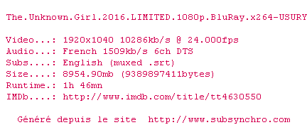 Voir le nfo de la release The.Unknown.Girl.2016.LIMITED.1080p.BluRay.x264-USURY