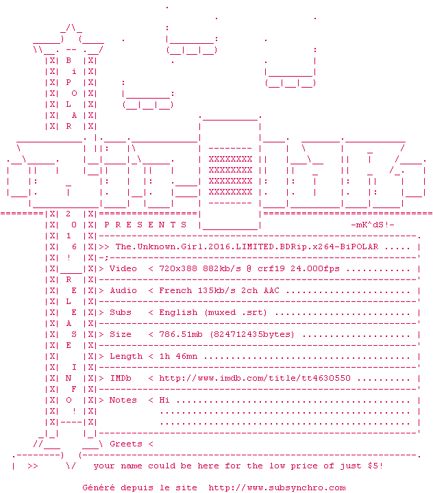 Voir le nfo de la release The.Unknown.Girl.2016.LIMITED.BDRip.x264-BiPOLAR