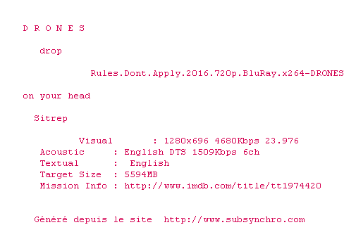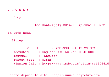 Voir le nfo de la release Rules.Dont.Apply.2016.720p.BluRay.x264-DRONES