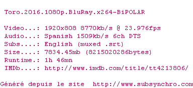 Voir le nfo de la release Toro.2016.BDRip.x264-BiPOLAR