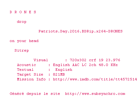 Le commentaire de oleo Commente par oleo (81), Le Mercredi 05 Avril 2017 à 12h39 Je ne suis pas du tout d'accord avec les mauvaises notes et l'aspect propagande qui n'a vraiment rien à voir. Ce film retrace avec beaucoup (trop?) de véracité les faits et c'est proprement ahurissant et glaçant. les enjeux et les risques d'une traque orientée qui pourrait nuire à la population musulmane, la reconstitution pharaonique et minutieuse de l'enquête, les interrogations personnelles, les doutes, la peur, l'incompréhension face à la détermination totalement hallucinée de ces deux hommes frapadindues. Perso c'est un grand film humaniste et oui, ensemble, partout dans le monde, nous sommes plus fort face à ces illuminés. 8.5 / 10 Le commentaire de ahuribarbu Commente par ahuribarbu (144), Le Jeudi 06 Avril 2017 à 18h18 Un pouce levé à ton commentaire, parce que c'est vrai, ça prend aux tripes. Et je crois aussi que l'amour est la meilleure réponse à la violence. Mais une réponse au sujet de la notion de propagande, je souhaite expliquer (un peu) pourquoi j'utilise ce terme. Car on est en plein dedans. N'oublions pas que c'est un des premiers rôles du cinéma, et ensuite ici on ne parle que de l'amour des bons américains face à un ennemi fondamentalement mauvais. Cela n'a bien évidemment aucun sens tout comme le traitement de l'information sur le terrorisme qu'on subit tous les jours dans les media. Aucune réflexion sur la part de responsabilité des USA (tellement énorme) sur la montée de la violence, ni sur les causes qui amènent des êtres humains à poser des actes aussi inhumains (je parle des poseurs de bombes). Donc, un film à sens unique, pour persuader que les américains sont les gentils et les victimes... Or il n'y a que des victimes de tous les côtés, dans ces histoires. 1 0 1 0
