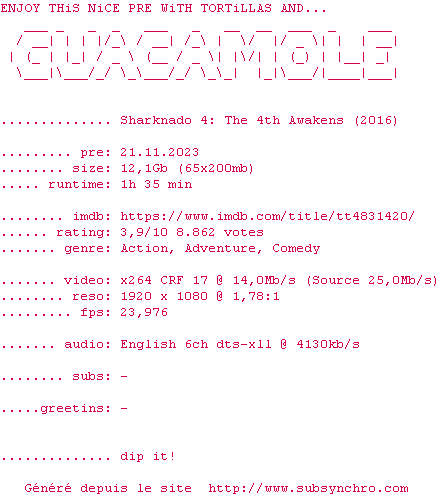 Voir le nfo de la release Sharknado.4.The.4th.Awakens.2016.iNTERNAL.1080p.BluRay.x264-GUACAMOLE