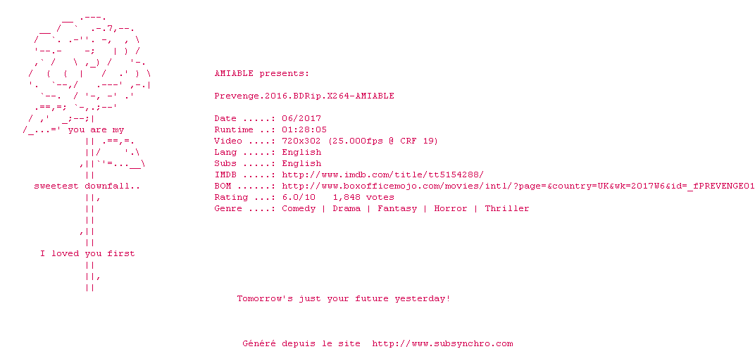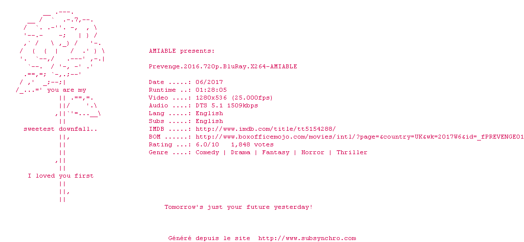 Voir le nfo de la release Prevenge.2016.720p.BluRay.x264-AMIABLE