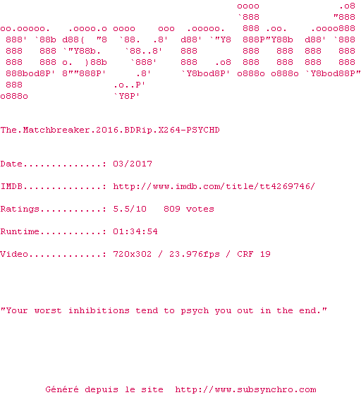 | Voir le nfo de la release The.Matchbreaker.2016.BDRip.x264-PSYCHD | PSYCHD | The.Matchbreaker.2016.BDRip.x264-PSYCHD OpenSubtitles | 0 fichier |