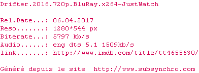 Voir le nfo de la release Drifter.2016.1080p.BluRay.x264-JustWatch