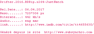 Voir le nfo de la release Drifter.2016.720p.BluRay.x264-JustWatch