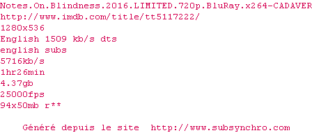 | Voir le nfo de la release Notes.On.Blindness.2016.LIMITED.720p.BluRay.x264-CADAVER | CADAVER | Notes.On.Blindness.2016.LIMITED.720p.BluRay.x264-CADAVER OpenSubtitles | 0 fichier | ||