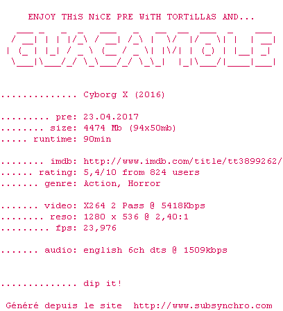 | Voir le nfo de la release Cyborg.X.2016.BDRiP.x264-GUACAMOLE | GUACAMOLE | Cyborg.X.2016.BDRiP.x264-GUACAMOLE OpenSubtitles | 0 fichier |