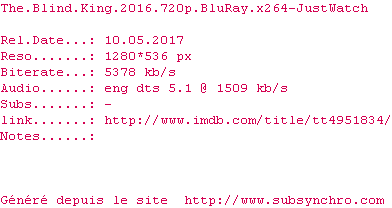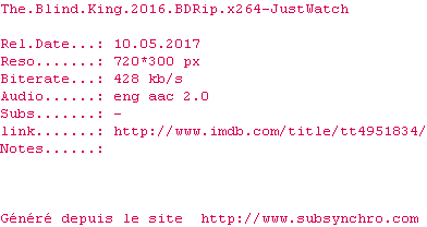 | Voir le nfo de la release The.Blind.King.2016.BDRip.x264-JustWatch | JustWatch | The.Blind.King.2016.BDRip.x264-JustWatch OpenSubtitles | 0 fichier |