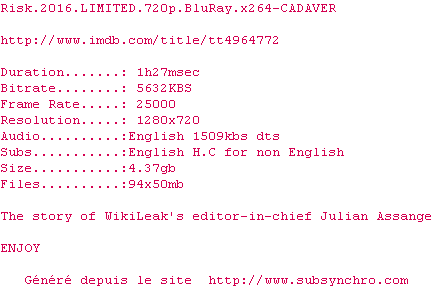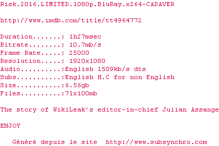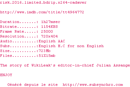 Voir le nfo de la release Risk.2016.LIMITED.1080p.BluRay.x264-CADAVER