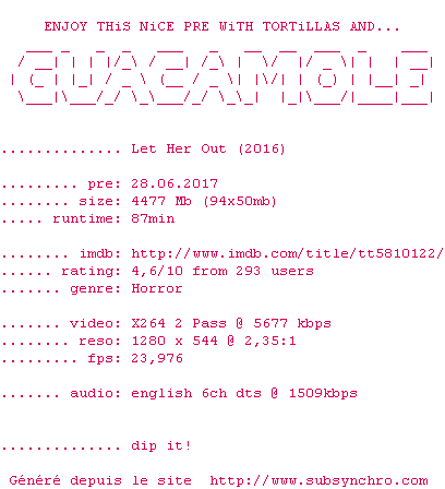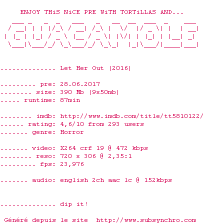 Voir le nfo de la release Let.Her.Out.2016.BDRiP.x264-GUACAMOLE
