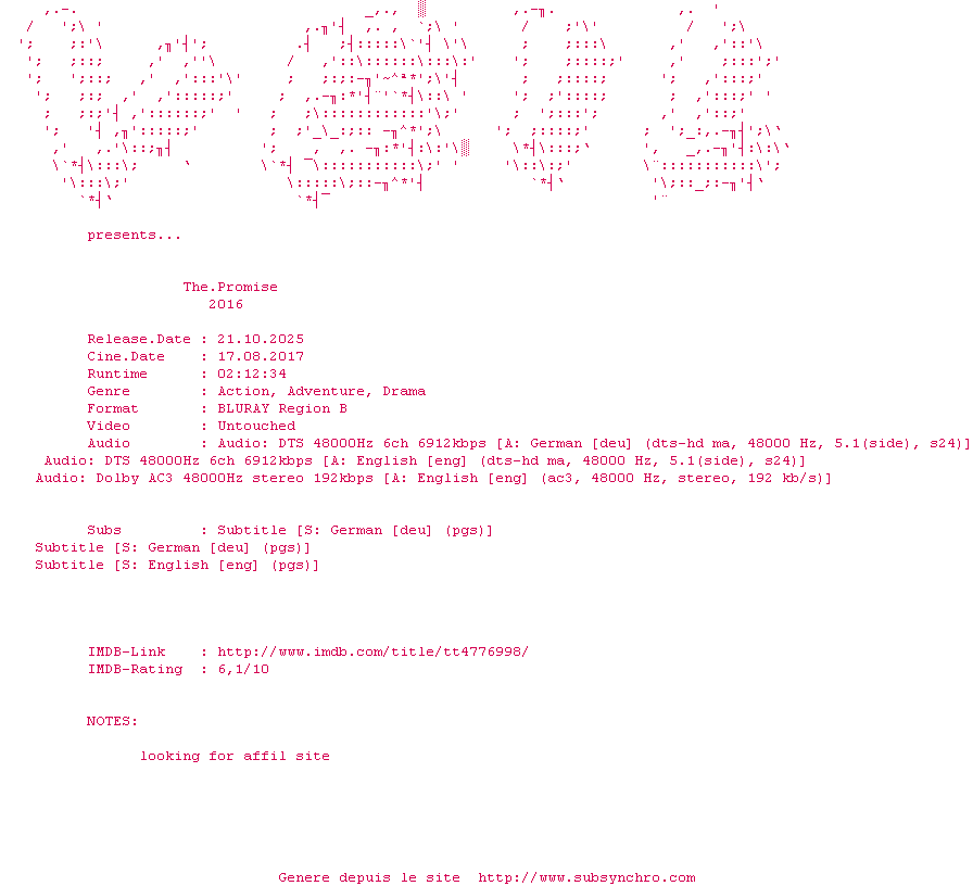 Voir le nfo de la release The.Promise.2016.DUAL.COMPLETE.BLURAY.iNTERNAL-VEiL