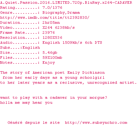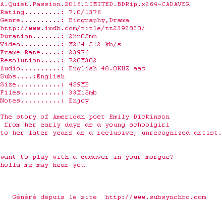 Voir le nfo de la release A.Quiet.Passion.2016.LIMITED.BDRip.x264-CADAVER