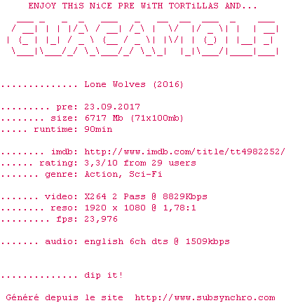 Voir le nfo de la release Lone.Wolves.2016.1080p.BluRay.x264-GUACAMOLE