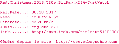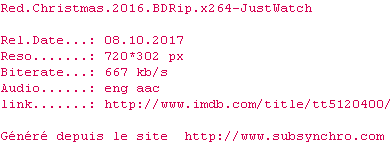 | Voir le nfo de la release Red.Christmas.2016.BDRip.x264-JustWatch | JustWatch | Red.Christmas.2016.BDRip.x264-JustWatch OpenSubtitles | 0 fichier |