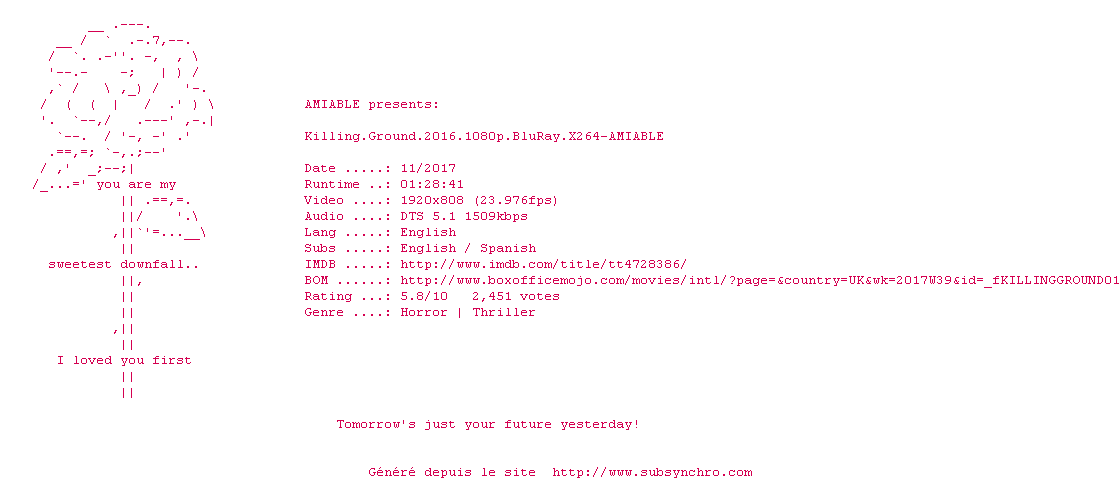Voir le nfo de la release Killing.Ground.2016.1080p.BluRay.x264-AMIABLE