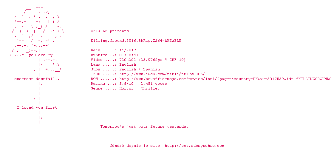 Voir le nfo de la release Killing.Ground.2016.720p.BluRay.x264-AMIABLE