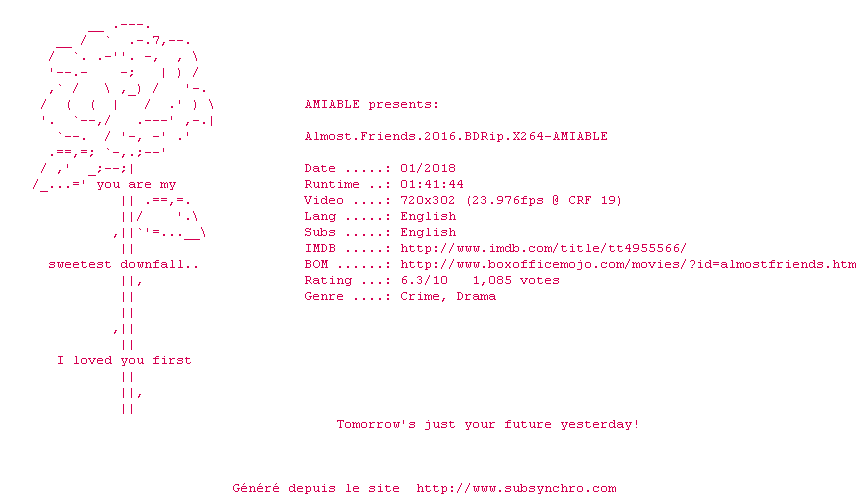 Voir le nfo de la release Almost.Friends.2016.1080p.BluRay.x264-AMIABLE
