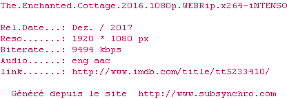 Voir le nfo de la release The.Enchanted.Cottage.2016.1080p.WEBRip.x264-iNTENSO