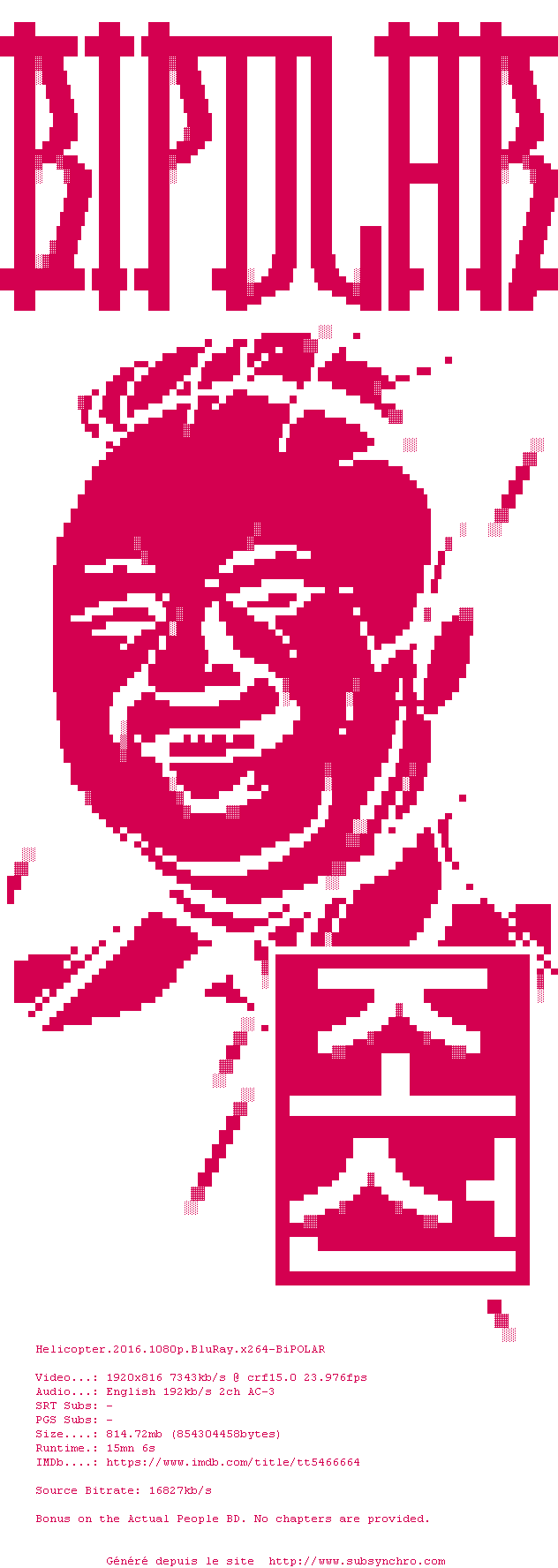 Voir le nfo de la release Helicopter.2016.1080p.BluRay.x264-BiPOLAR