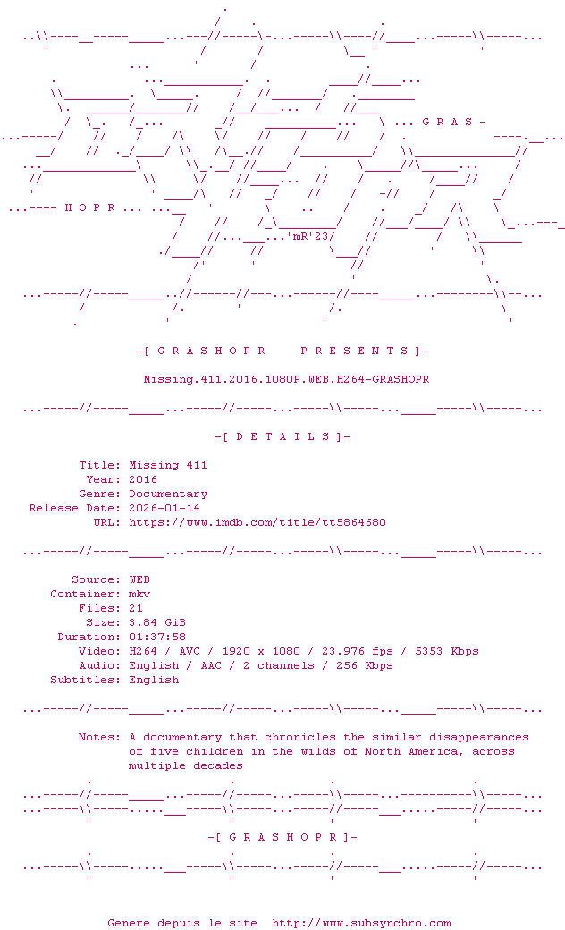Y avez-vous pense ? Nous proposons déjà 1818 sous-titres pour le film Missing 411. Avez-vous essaye de voir si ces sous-titres etaient compatibles avec cette release ? On vous laisse le soin de tester cela pour nous et de contribuer au site en postant le sous-titre en cas de compatiblite constatee !