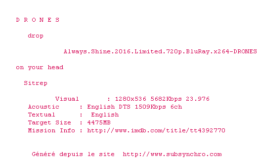 Telechargez le RSS « Fichier de la release Always.Shine.2016.Limited.720p.BluRay.x264-DRONES »
