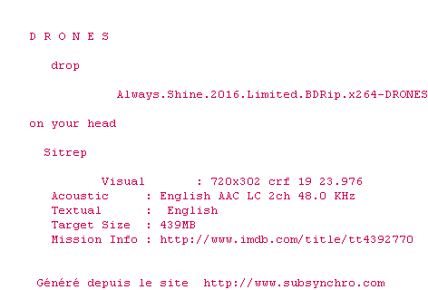 Telechargez le RSS « Fichier de la release Always.Shine.2016.Limited.BDRip.x264-DRONES »