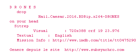 Telechargez le RSS « Fichier de la release Hail.Caesar.2016.BDRip.x264-DRONES »