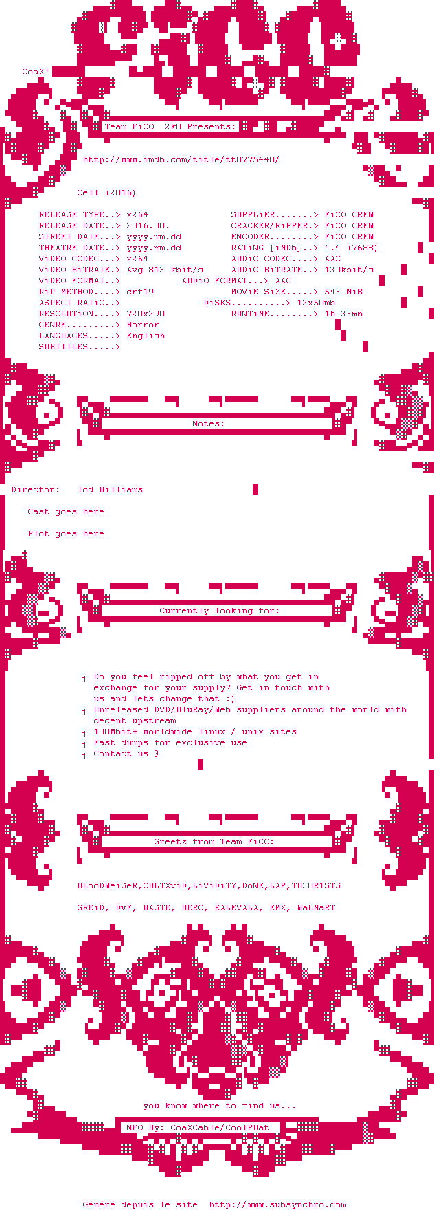 Y avez-vous pense ? Nous proposons déjà 1379 sous-titres pour le film Cell Phone. Avez-vous essaye de voir si ces sous-titres etaient compatibles avec cette release ? On vous laisse le soin de tester cela pour nous et de contribuer au site en postant le sous-titre en cas de compatiblite constatee !