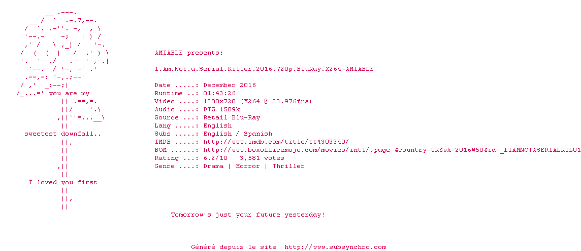Telechargez le RSS « Fichier de la release I.Am.Not.A.Serial.Killer.2016.720p.BluRay.x264-AMIABLE »