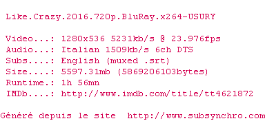 like.crazy.2016.bluray.x264-usury.fr.srt Ajouté par SubSynchro Ajoute le 20-12-2016 11:11:18 Format : SRT Italique : Oui Taille : 0.00Ko Telechargement : 64 Sous-titre Extrait d'un DVD Z2 Merci às-t.eu Ajouter cette release à ma collection en cas de telechargement des sous-titres 0 0 0 Telecharger le ZiP contenant NFO, Affiche, Sous-titre (*.srt) Commentez le fichier like.crazy.2016.bluray.x264-usury.fr.srt Commentez le fichier like.crazy.2016.bluray.x264-usury.fr.srt Commentez ce fichier Le fichier 1-1482228678.srt n'existe pas ! Telechargez le RSS « Fichier de la release Like.Crazy.2016.720p.BluRay.x264-USURY » Retour au film « Folles de joie »