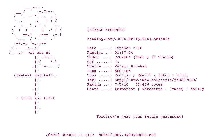 Telechargez le RSS « Fichier de la release Finding.Dory.2016.BDRip.x264-AMIABLE »