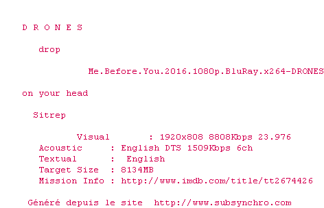 Telechargez le RSS « Fichier de la release Me.Before.You.2016.1080p.BluRay.x264-DRONES »