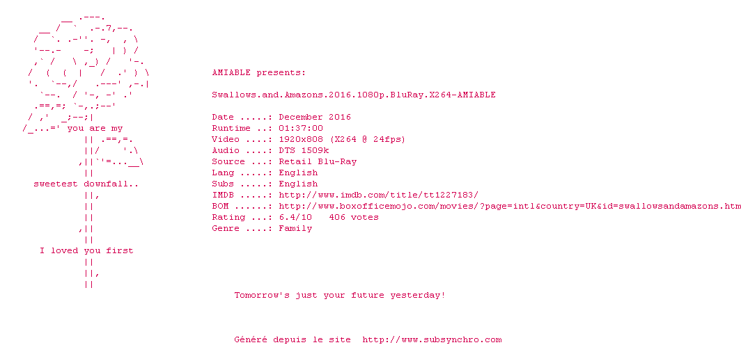 Telechargez le RSS « Fichier de la release Swallows.And.Amazons.2016.1080p.BluRay.x264-AMIABLE »