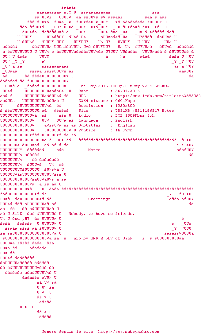 Telechargez le RSS « Fichier de la release The.Boy.2016.1080p.BluRay.x264-GECKOS »