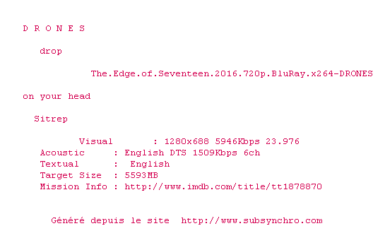 Telechargez le RSS « Fichier de la release The.Edge.Of.Seventeen.2016.720p.BluRay.x264-DRONES »