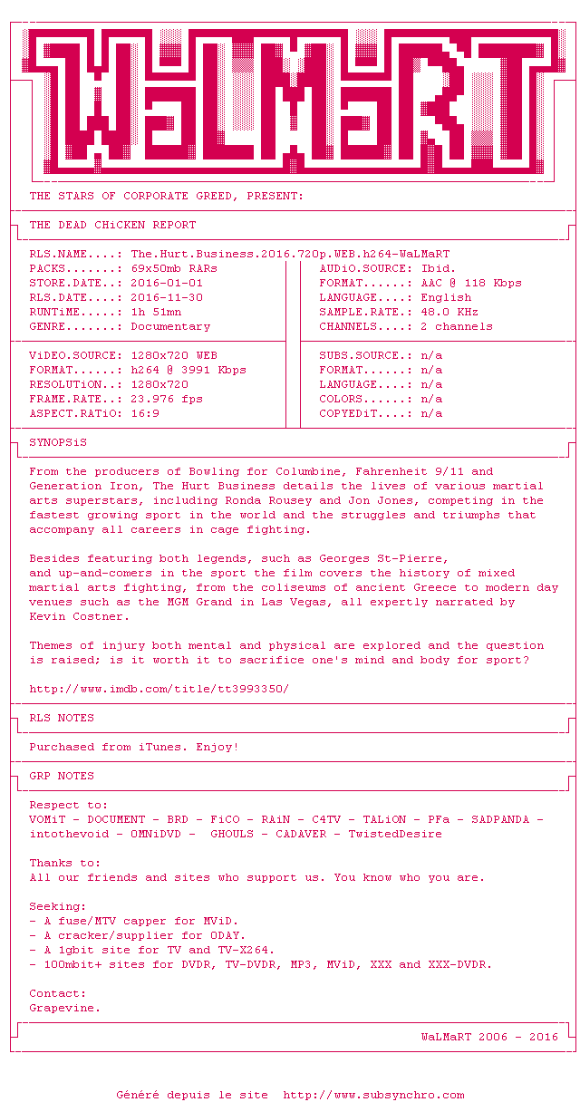 Telechargez le RSS « Fichier de la release The.Hurt.Business.2016.720p.WEB.H264-WaLMaRT »