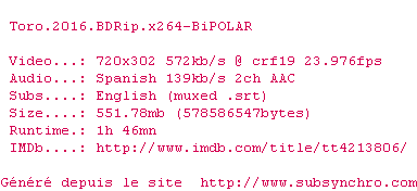 Telechargez le RSS « Fichier de la release Toro.2016.BDRip.x264-BiPOLAR »