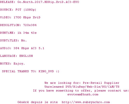 | Voir le nfo de la release Go.North.2017.HDRip.XviD.AC3-EVO | EVO | Go.North.2017.HDRip.XviD.AC3-EVO OpenSubtitles | 0 fichier | ||